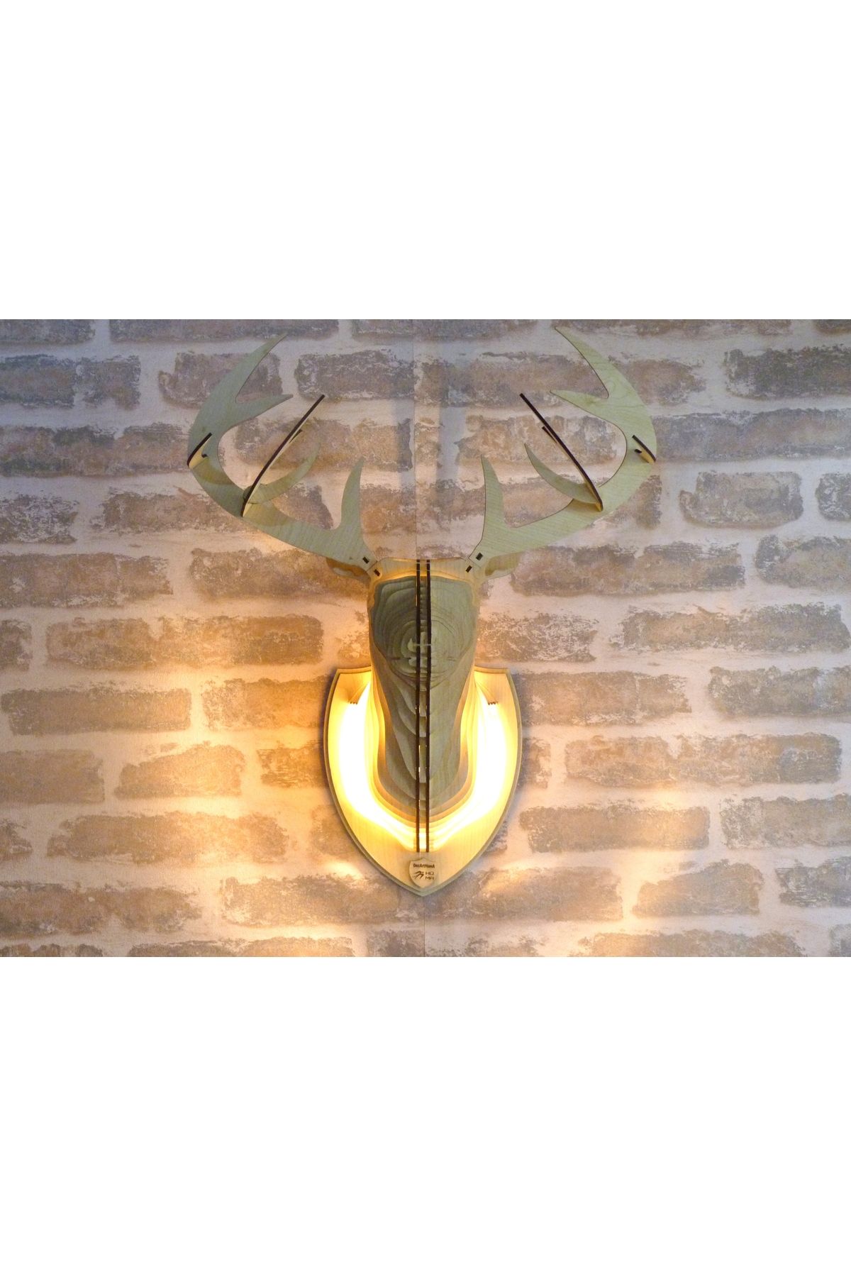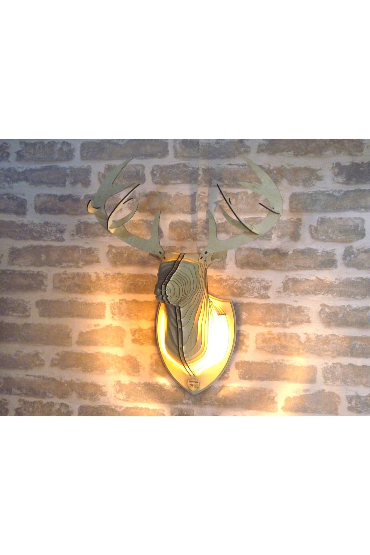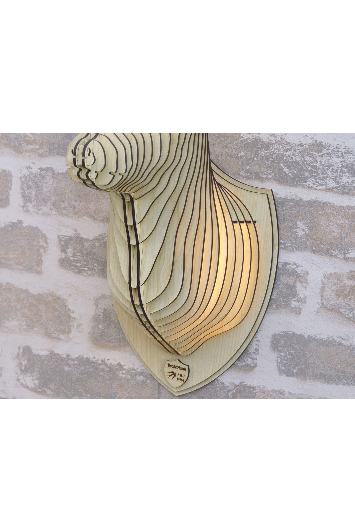 Akça3 Geyik Kafası Tasarımlı Doğal Ahşap Lazer Kesim Rustik Salon Aplik Duvar Dekoru (Ampul Dahil)