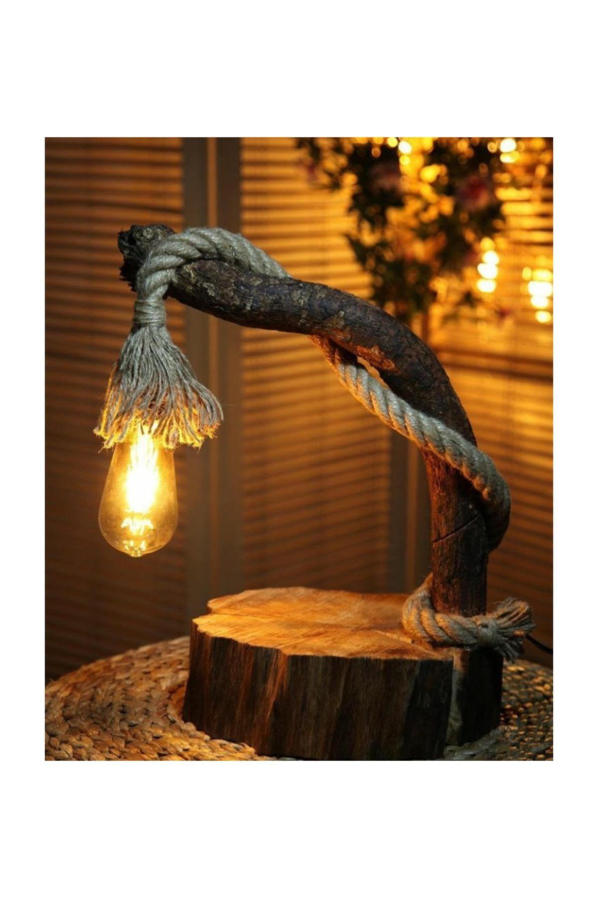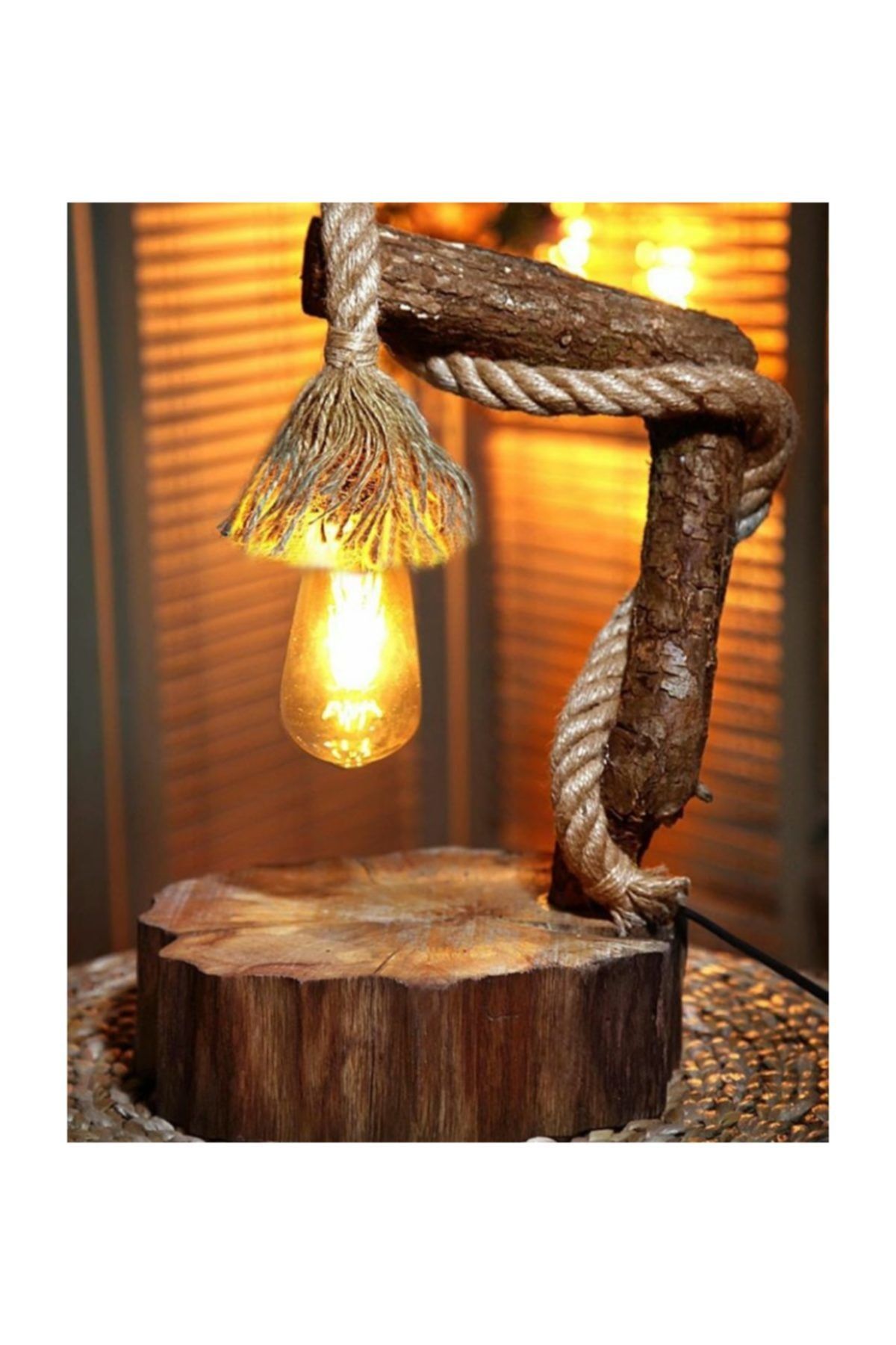 Doğal Ahşap Halatlı Retro Rustik Abajur – Masa Lambası