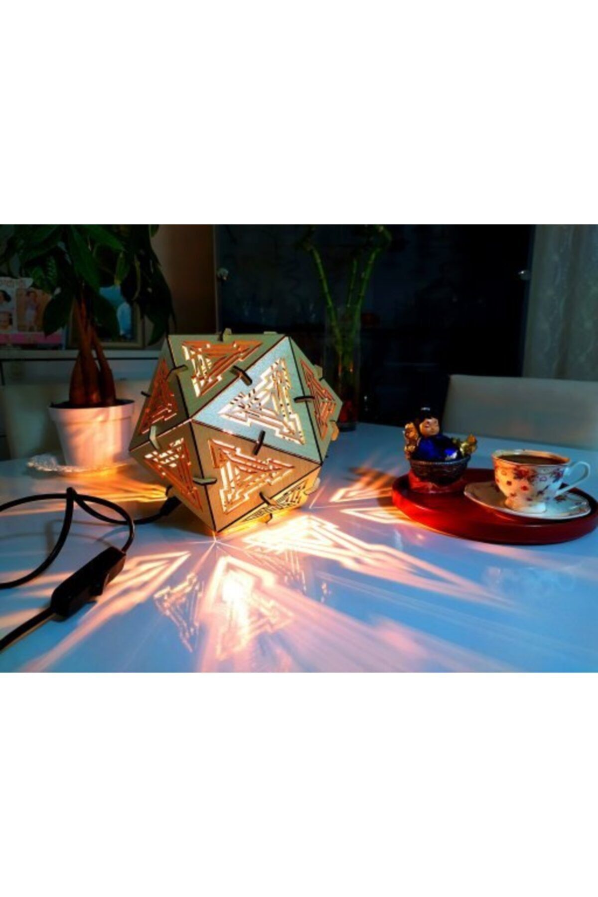 Kartopu doğal ahşap MDF malzemeden üretilmiş olup, salon veya yatak odası gibi alanlarınızda doğal bir dokunuş katmak için idealdir.; E14 duy tipi sayesinde standart ampullerle uyumludur, bu da kolayca değiştirilebilirlik sağlar.; Üç boyutlu tasarımı ile mekanınıza derinlik katar ve görsel olarak zenginleştirir.; Masa veya gece lambası olarak kullanıma uygun olup, fonksiyonellikle estetiği buluşturan mükemmel bir aksesuardır.; Doğal ahşap dokusuyla hem şık hem de sıcak bir atmosfer oluşturur, evinizin dekorasyonuna sıcaklık katar.;